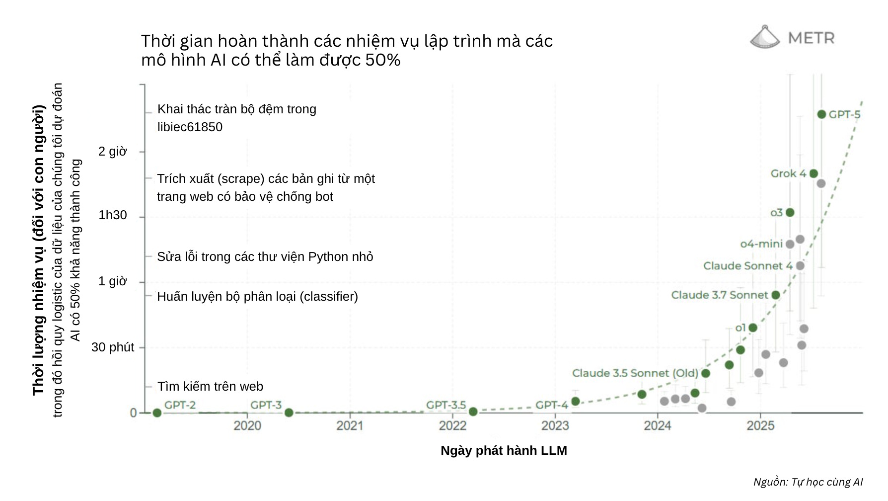 Một bài test dài hạn của METR đo số bước AI có thể thực hiện liên tục với >50% chính xác — và từ GPT-3 đến GPT-5, đường cong tăng gần như tuyệt đối đều đặn trong suốt 5 năm.