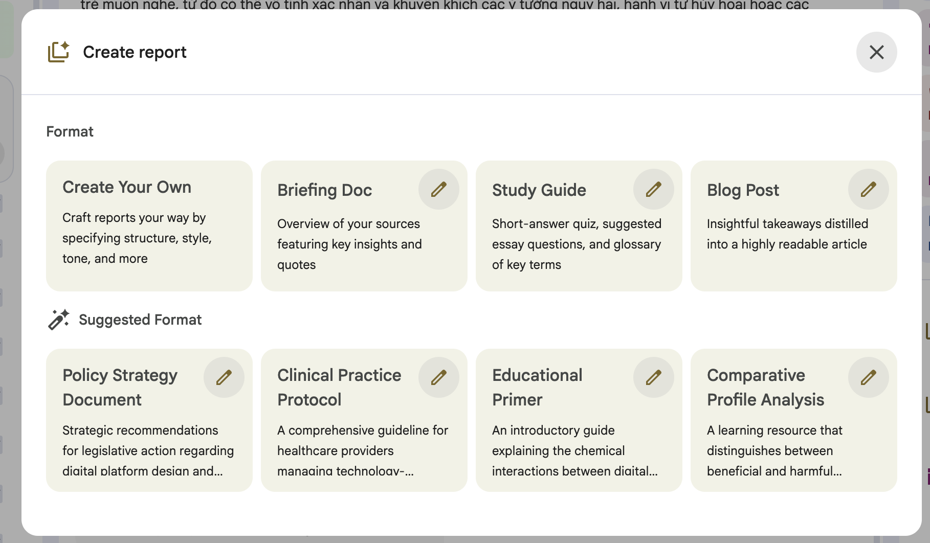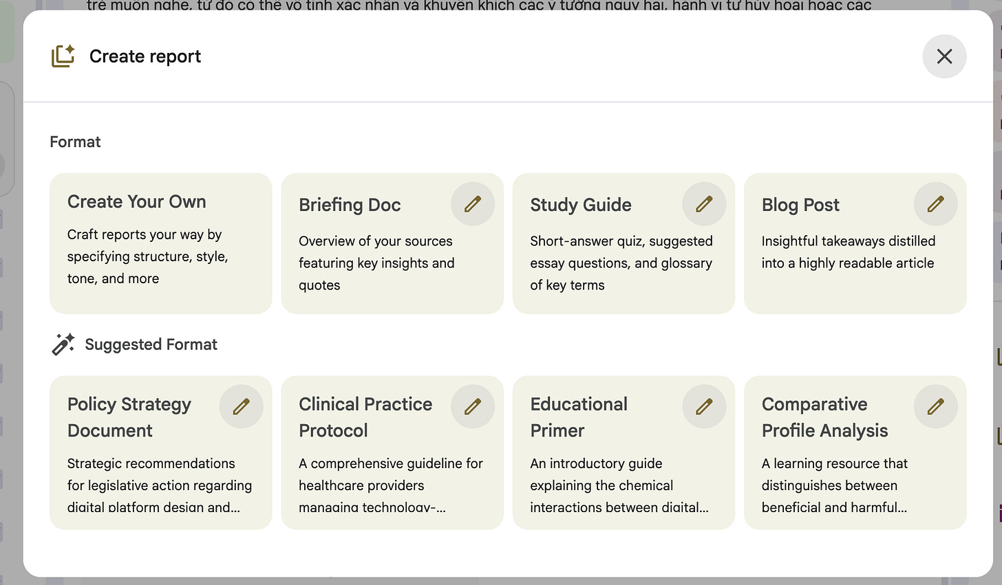 Tại đây bạn có thể dùng prompt để tạo những báo cáo theo nhu cầu cá nhân hoặc dùng những Format được gợi ý sẵn từ nền tảng.