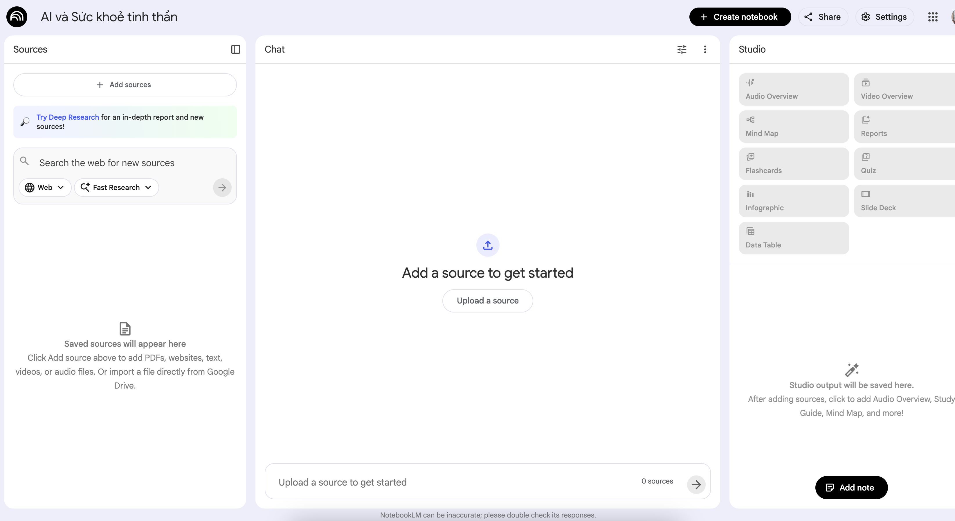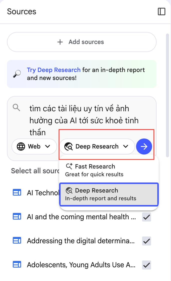 Dùng chế độ Deep Research của NotebookLM