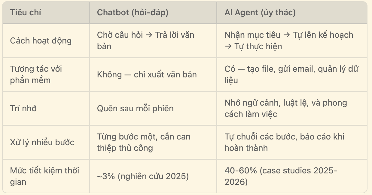 Nói cách khác: Chatbot giống tra cứu từ điển. AI Agent giống giao việc cho một trợ lý biết dùng máy tính.