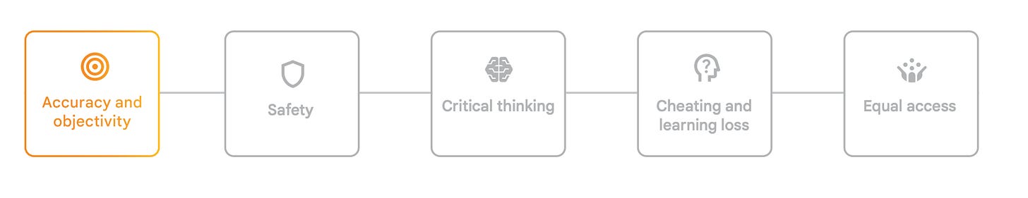Độ chính xác và khách quan: AI có thể tạo ra thông tin sai hoặc thiên vị. Thách thức sâu hơn là xác định nguồn đáng tin cậy và hướng dẫn học sinh qua các chủ đề chủ quan hoặc phức tạp.