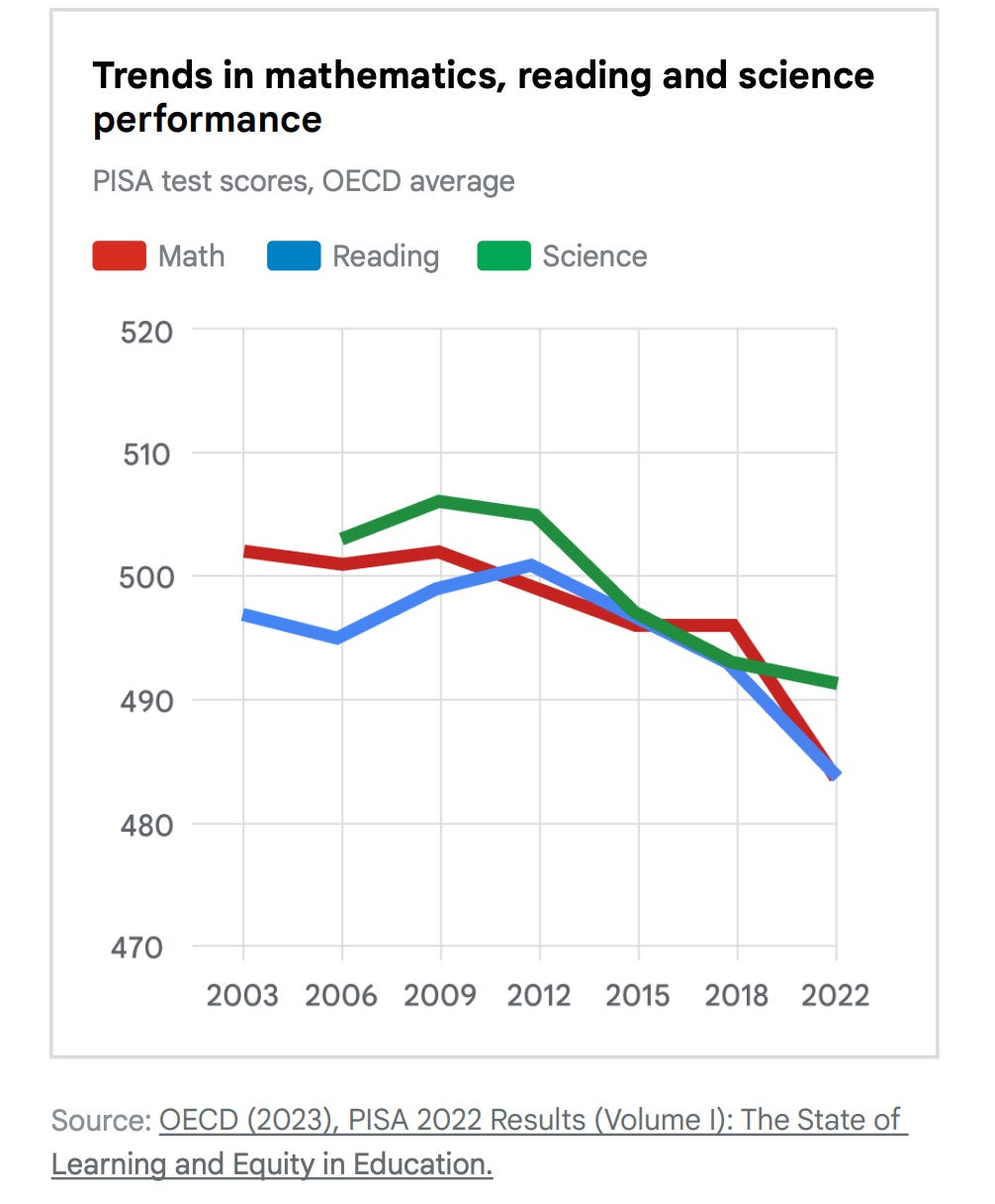 Dữ liệu PISA 2022 cho thấy rõ sự tụt dốc này: điểm Toán toàn cầu giảm 15 điểm và điểm Đọc giảm 10 điểm so với năm 2018. Điều đó chứng tỏ hệ thống giáo dục hiện tại không còn đủ sức đáp ứng nhu cầu học tập ngày càng đa dạng của người học.