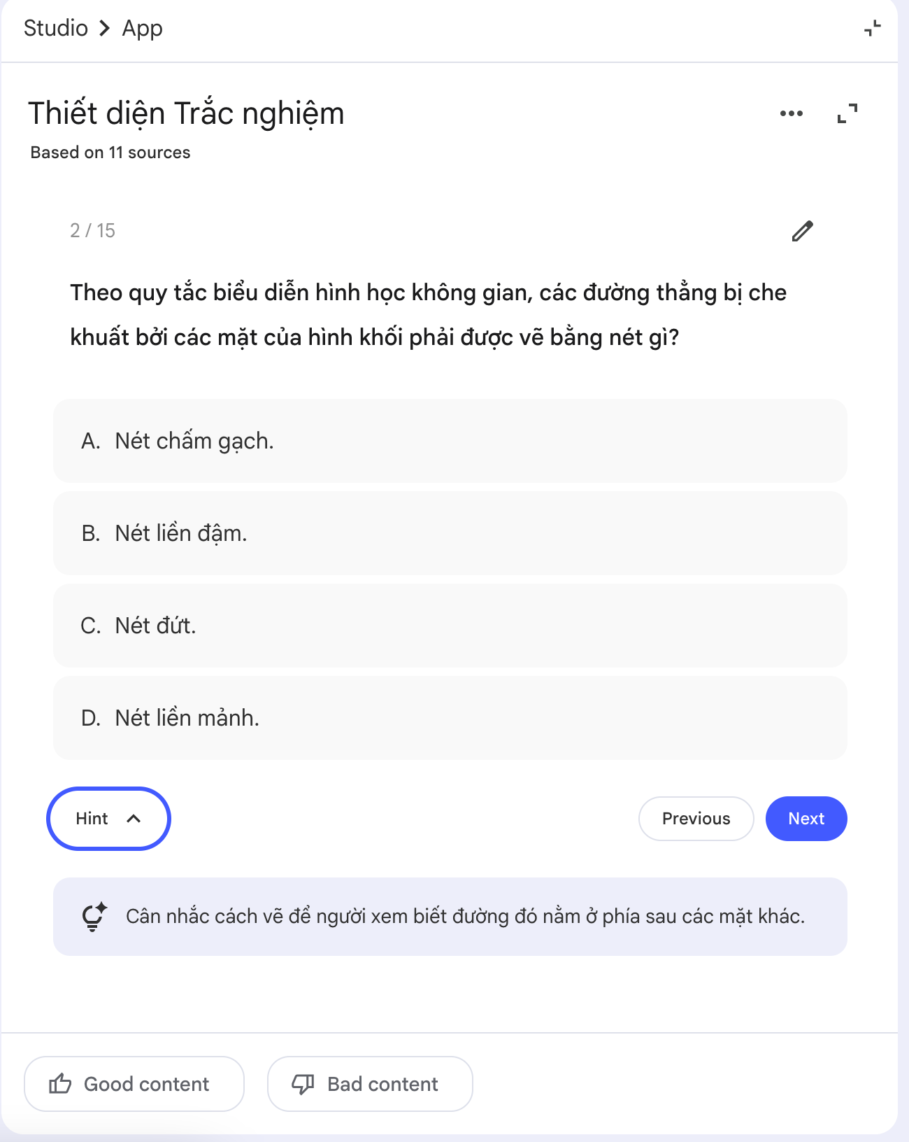 2. Yêu cầu tạo câu hỏi theo định dạng và mức độ cụ thể trong tính năng “Quiz” tại mục Studio phía bên phải màn hình, với mẫu prompt: