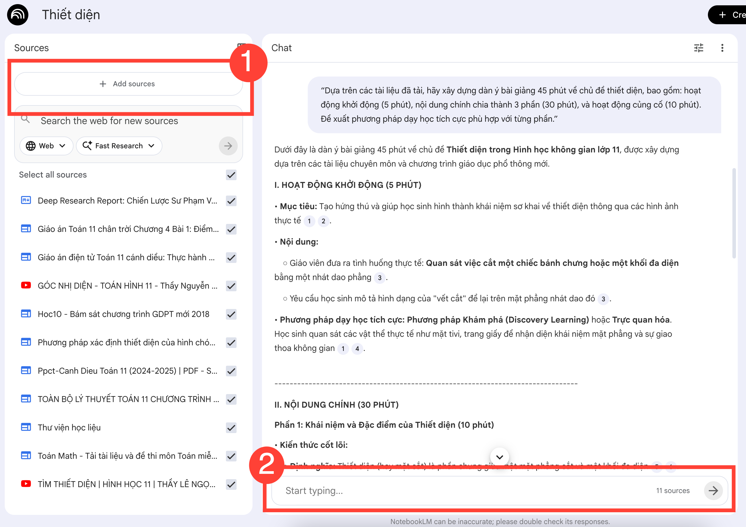 Tải lên các tài liệu liên quan: sách giáo khoa (PDF), slide bài giảng cũ, bài báo chuyên môn hoặc đường dẫn website,… tại mục “Add Sources” bên trái màn hình